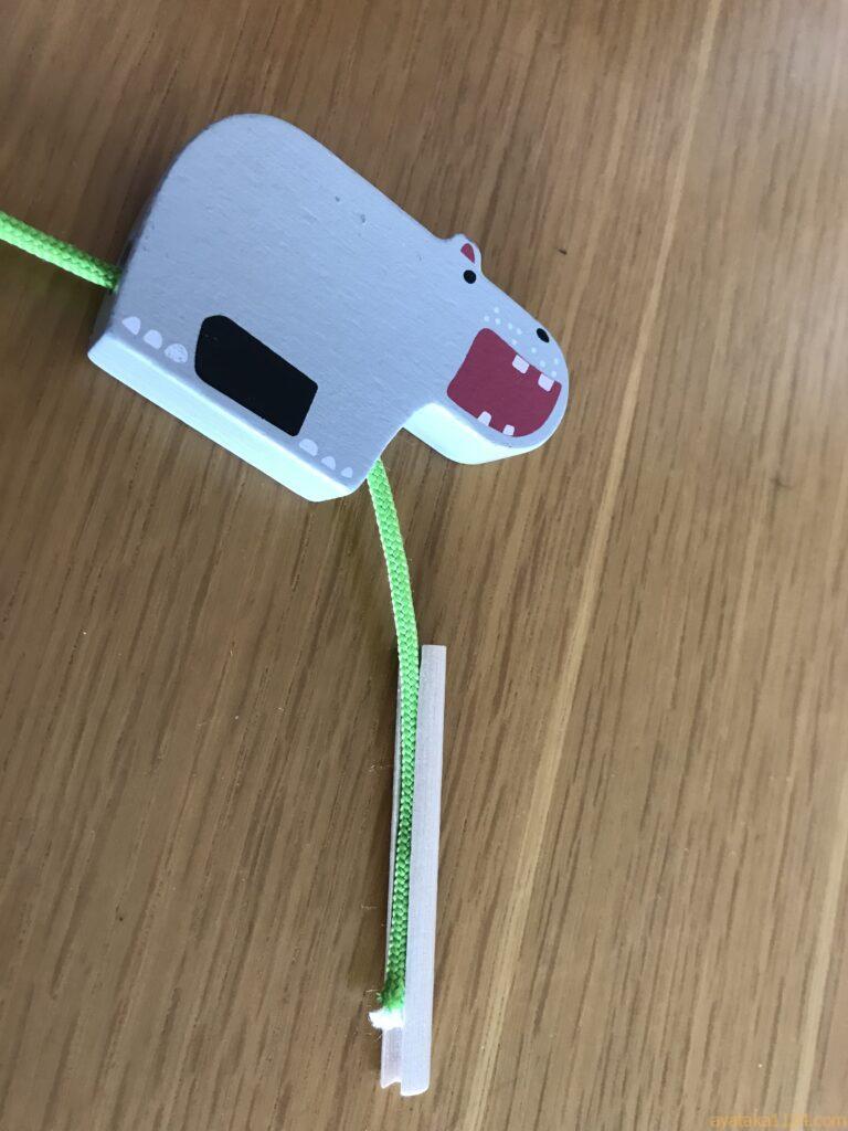 パネルに書いてる動物に糸を通していく知育おもちゃです。